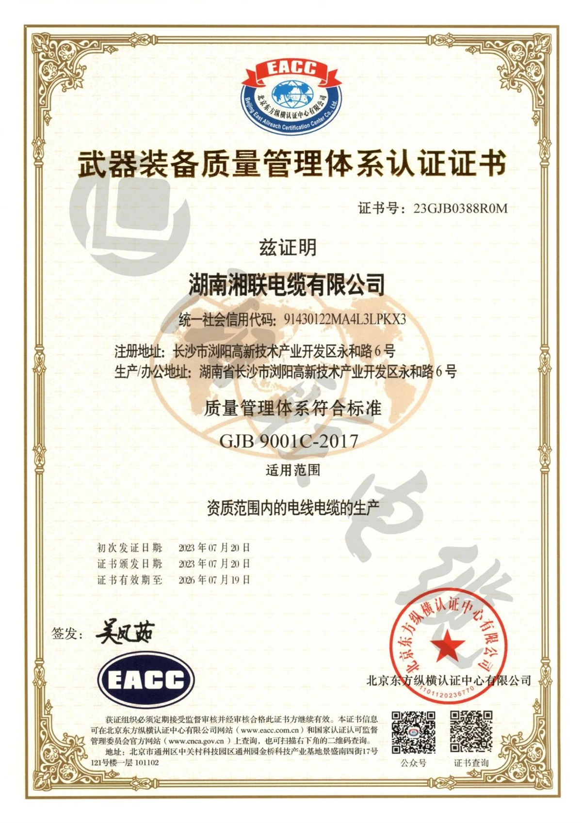 2023年,湘聯(lián)電纜順利通過國軍標質(zhì)量管理體系認證,獲得《武器裝備質(zhì)量管理體系認證證書》,質(zhì)量管理體系符合:GJB9001C-2017標準,這表明湘聯(lián)電纜的質(zhì)量管理體系符合武器裝備質(zhì)量管理體系的標準及相關(guān)要求,具備軍品研發(fā)、生產(chǎn)和服務(wù)的質(zhì)量管理能力。
